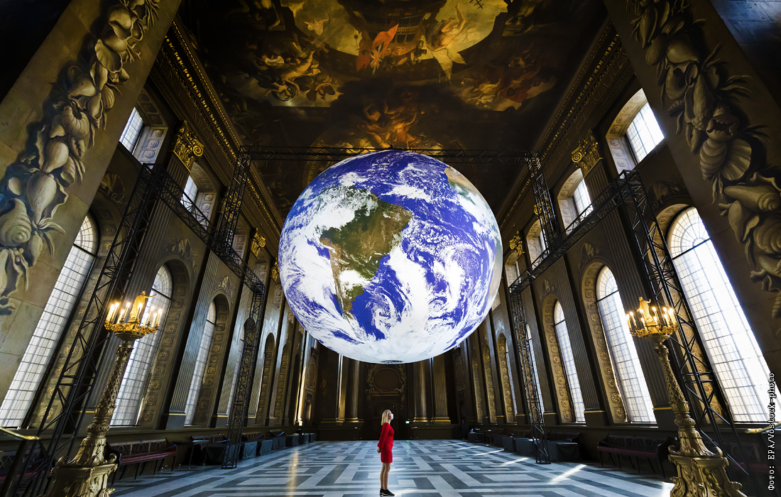 Инсталляция британского художника Люка Джеррама "Gaia" в Королевском военно-морском колледже в Лондоне. Модель вращается, что, как предполагается, воспроизводит ощущения, которое испытывают астронавты, когда видят Землю из космоса.