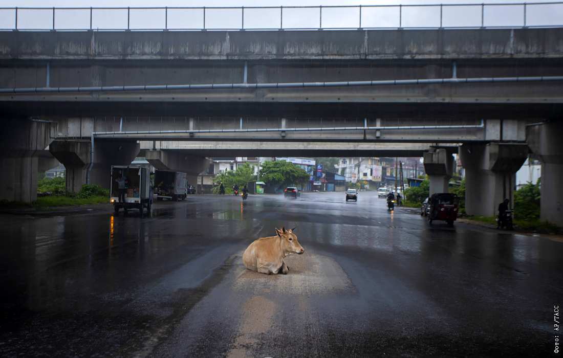 Корова укрывается от дождя под эстакадой на обычно многолюдном перекрестке во время локдауна, введенного в Коломбо, Шри-Ланка