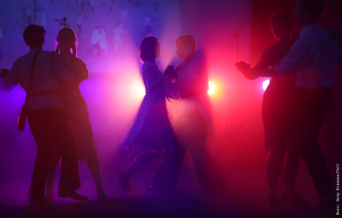 Жители города во время танцев в рамках акции "Свеча памяти" у Троицкого моста в Санкт-Петербурге