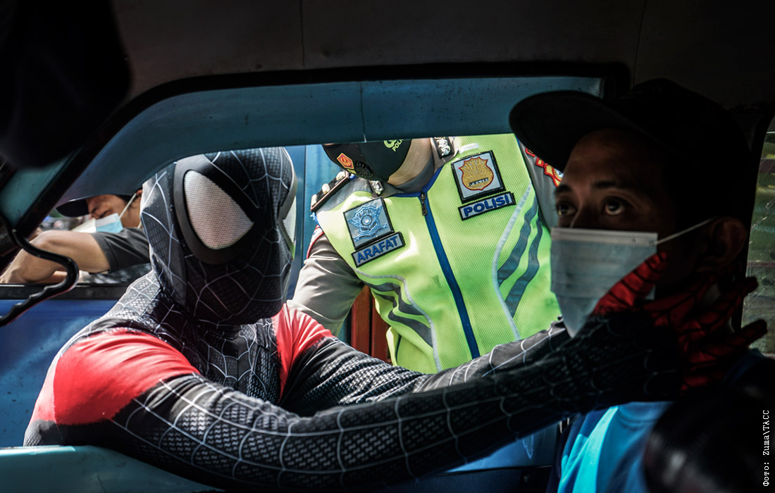 Индонезийская полиция в костюмах супергероев вышла на улицы города Макассар, напоминая жителям о мерах предосторожности во время пандемии