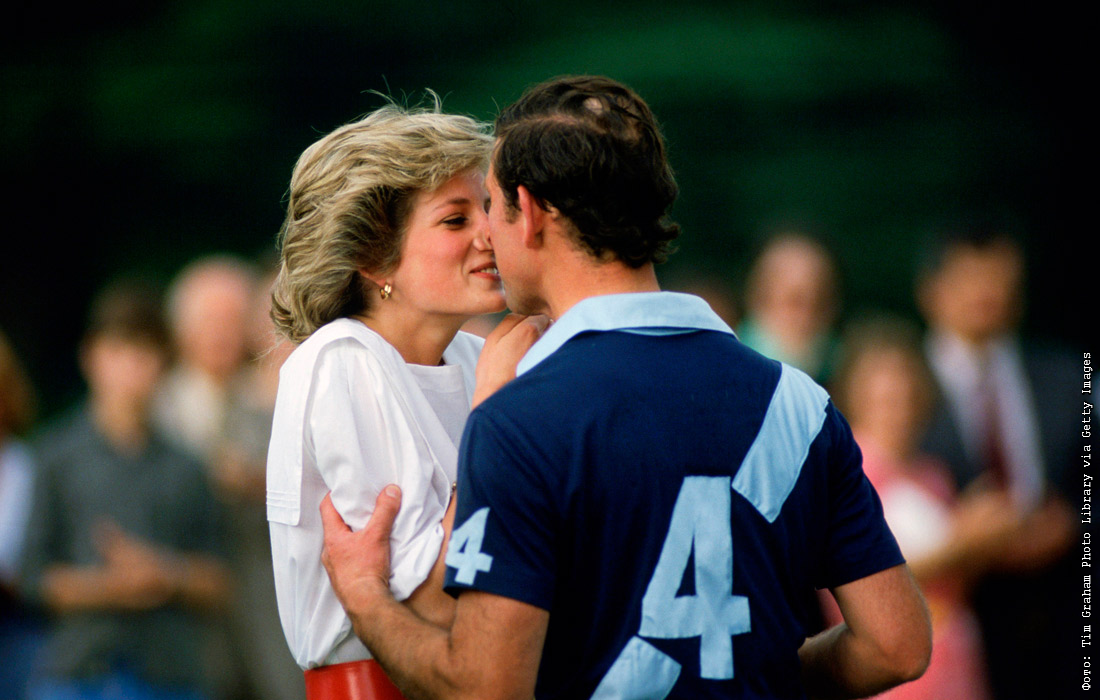 Принц Чарльз целует Диану во время вручения призов после матча по поло в Сайренчестере. Великобритания. Июнь 1985 года.