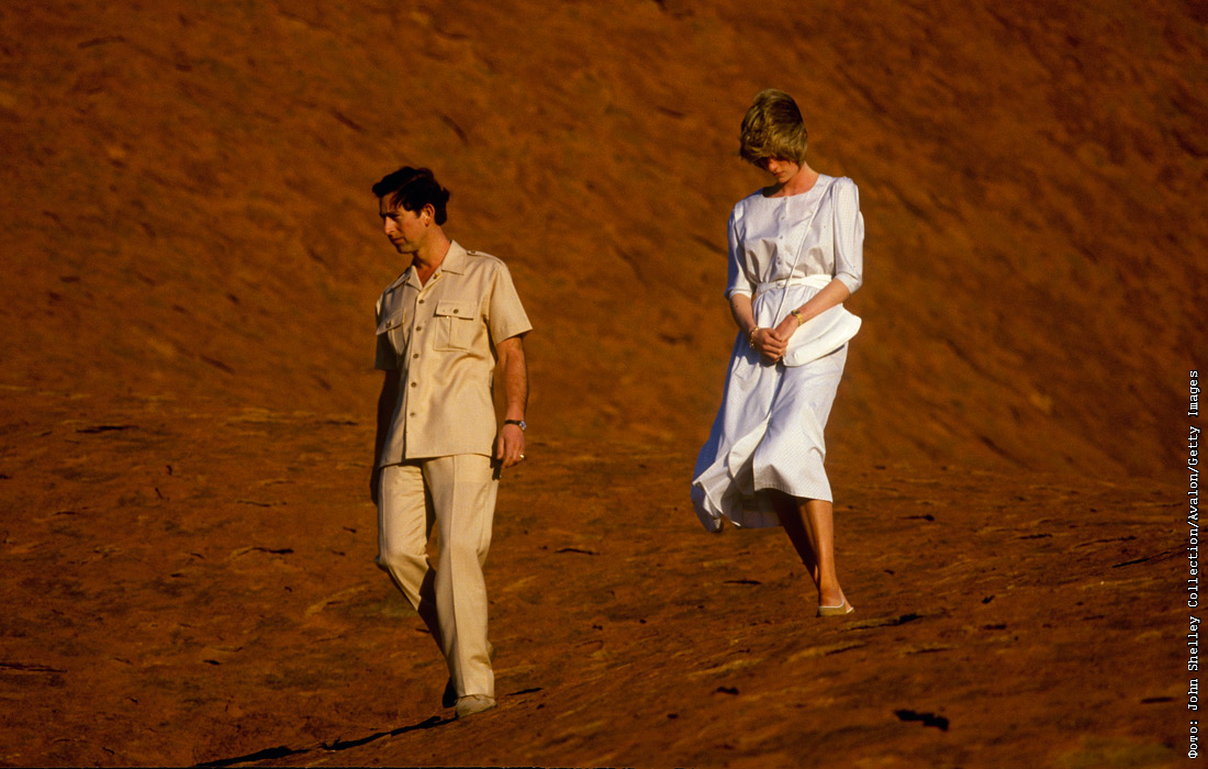 Принц Чарльз и принцесса Диана у подножья горы Улуру в национальном парке Австралии. Март 1983 года.