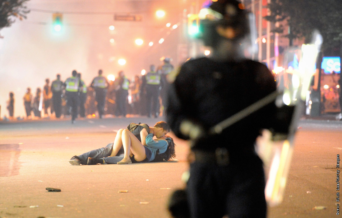 Знаменитая фотография поцелуя канадской пары во время уличных беспорядков в Ванкувере