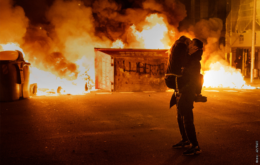 Пара демонстрантов перед горящей баррикадой во время протестов против ареста рэп-музыканта Пабло Хаселя в Барселоне