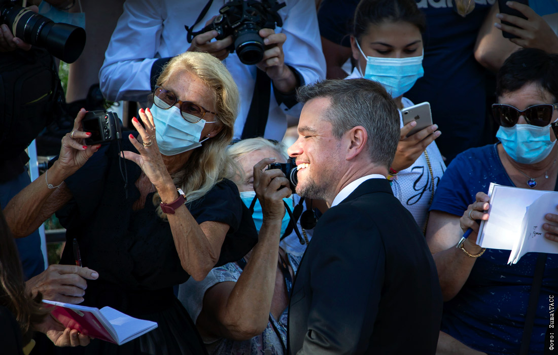Актер Мэтт Дэймон раздает автографы на красной ковровой дорожке кинофестиваля