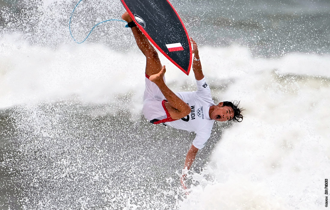 Индонезийский серфер Рио Вайда во время третьего раунда соревнований по серфингу среди мужчин