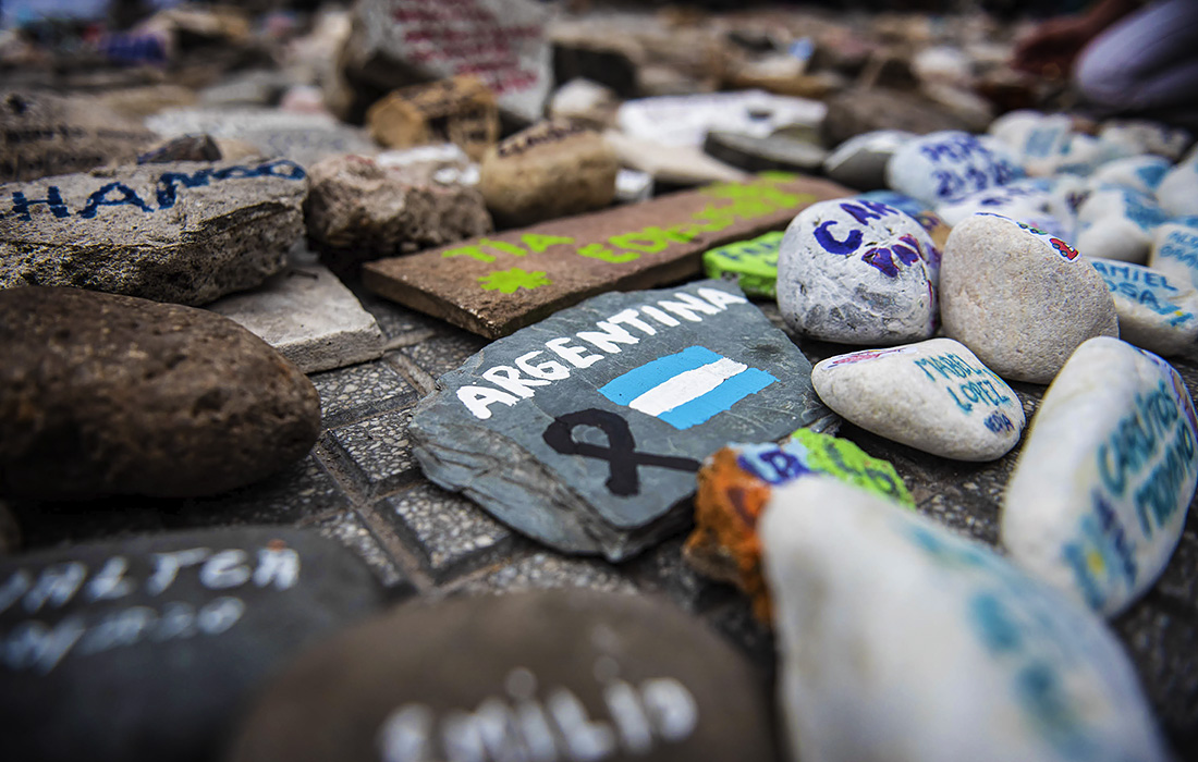 17 августа. Камни с именами умерших от коронавируса, разложенные на стихийном мемориале у здания правительства Буэнос-Айреса.