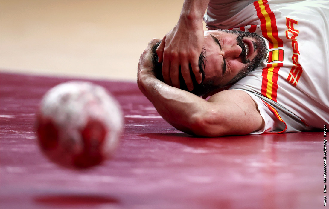 Испанский гандболист Рауль Энтрериос после падения во время матча против Германии
