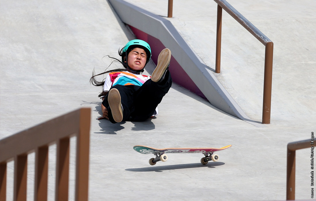 Преставительница Японии Фуна Накаяма во время соревнований по скейтбордингу