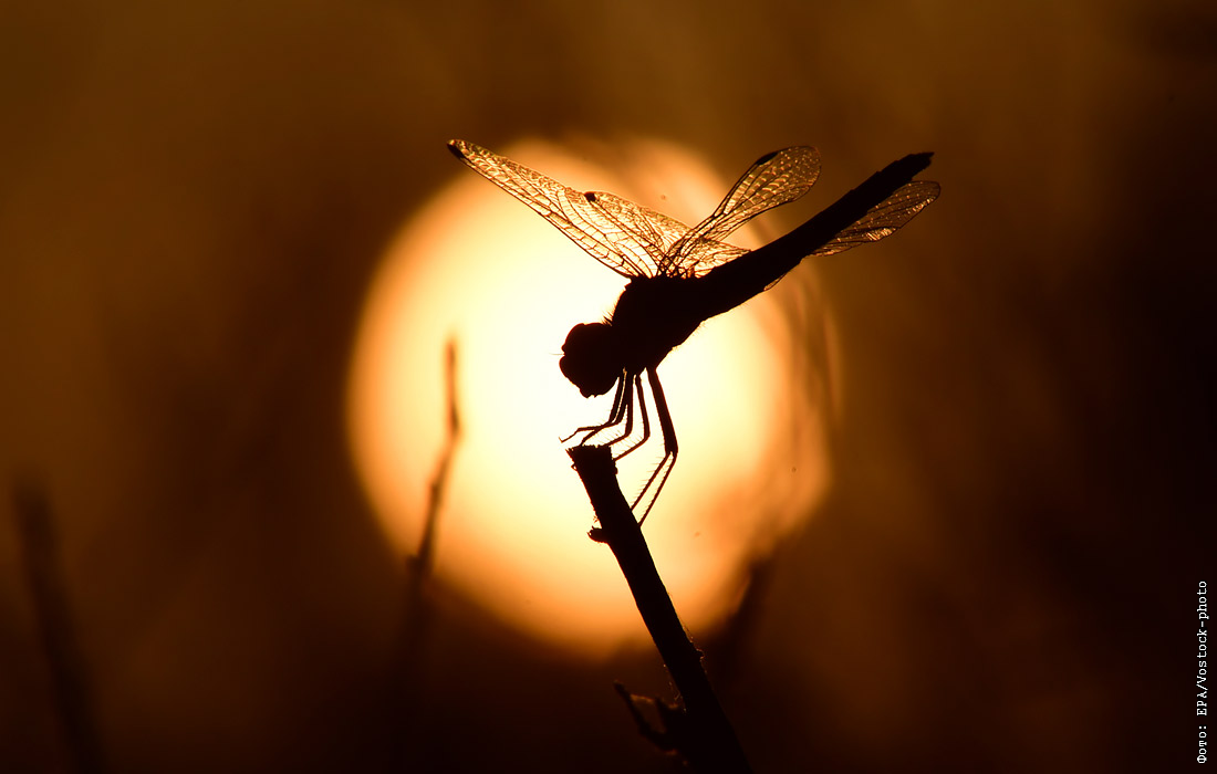 Стрекоза во время захода солнца в Нафплионе, Греция