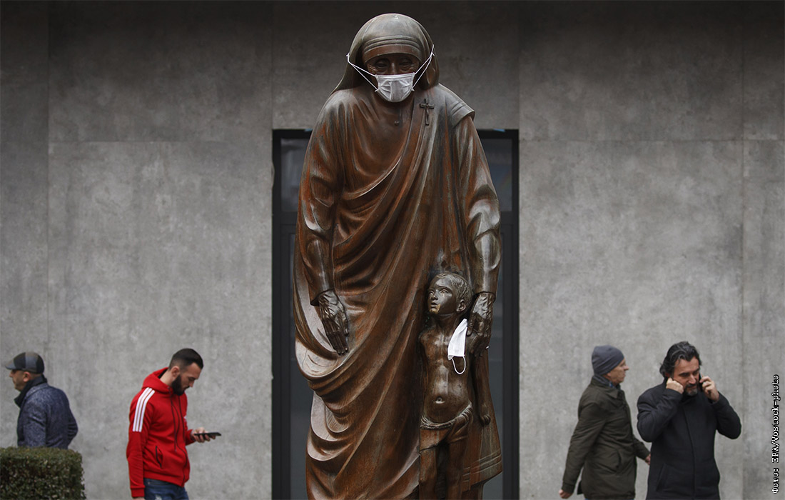 Один из пионеров масочного режима у статуй - скульптура Марии Терезы в Приштине. Она надела маску еще в 2019 году, защищаясь от вредных атмосферных выбросов.