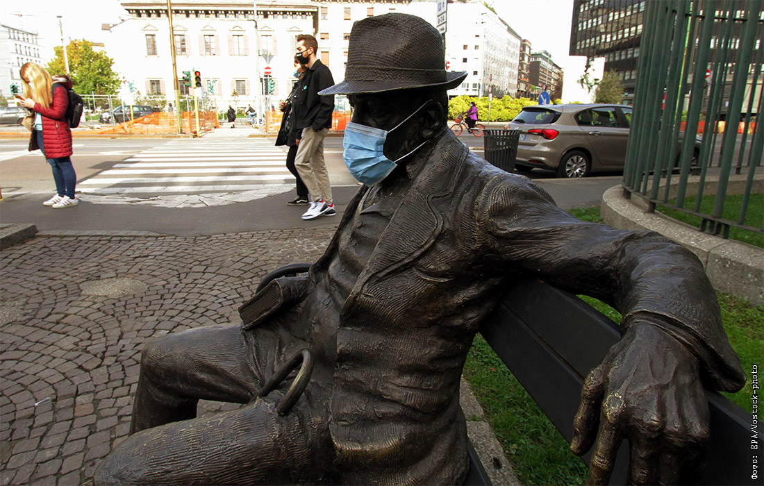 Статуя болгарского поэта Пенчо Славейкова сидит в маске на лавочке в Милане