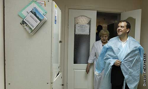 Премьер-министр РФ Дмитрий Медведев во время посещения Южно-Курильской центральной районной больницы