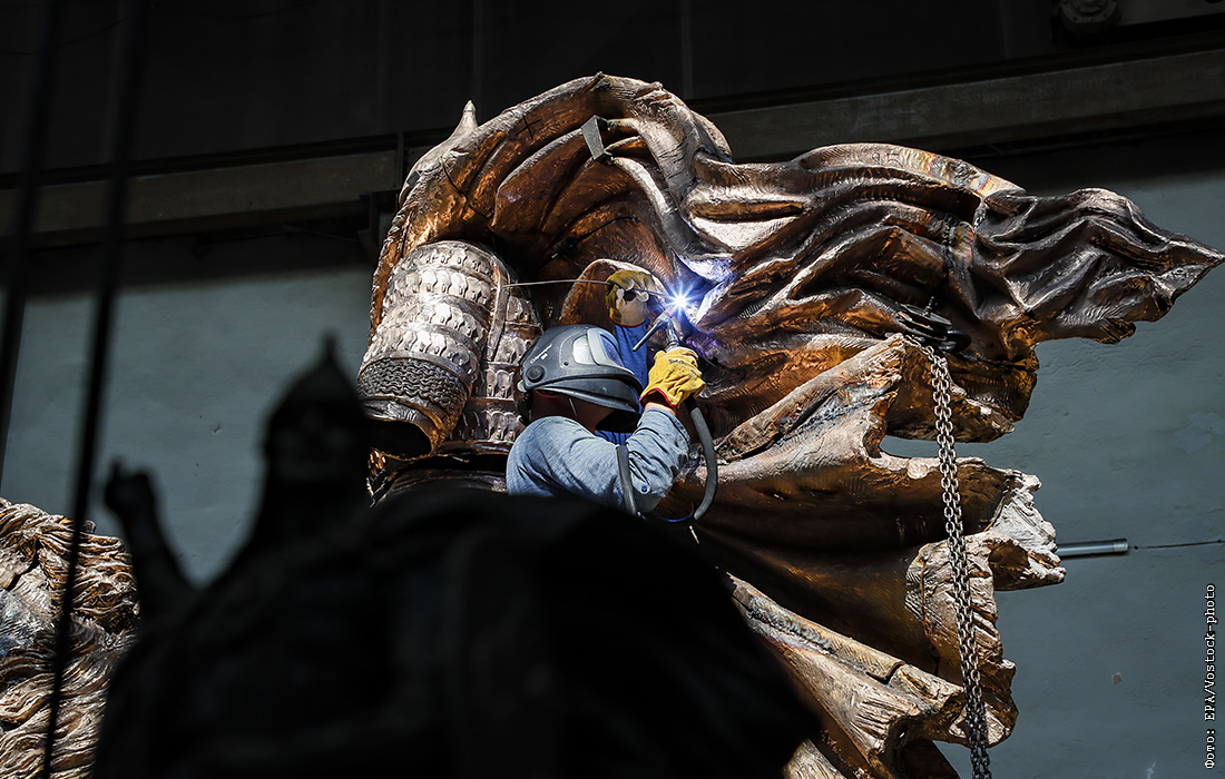 Сборка скульптурной композиции мемориального комплекса "Князь Александр Невский с дружиной" скульптора Виталия Шанова и архитектора Константина Фомина в Московской области