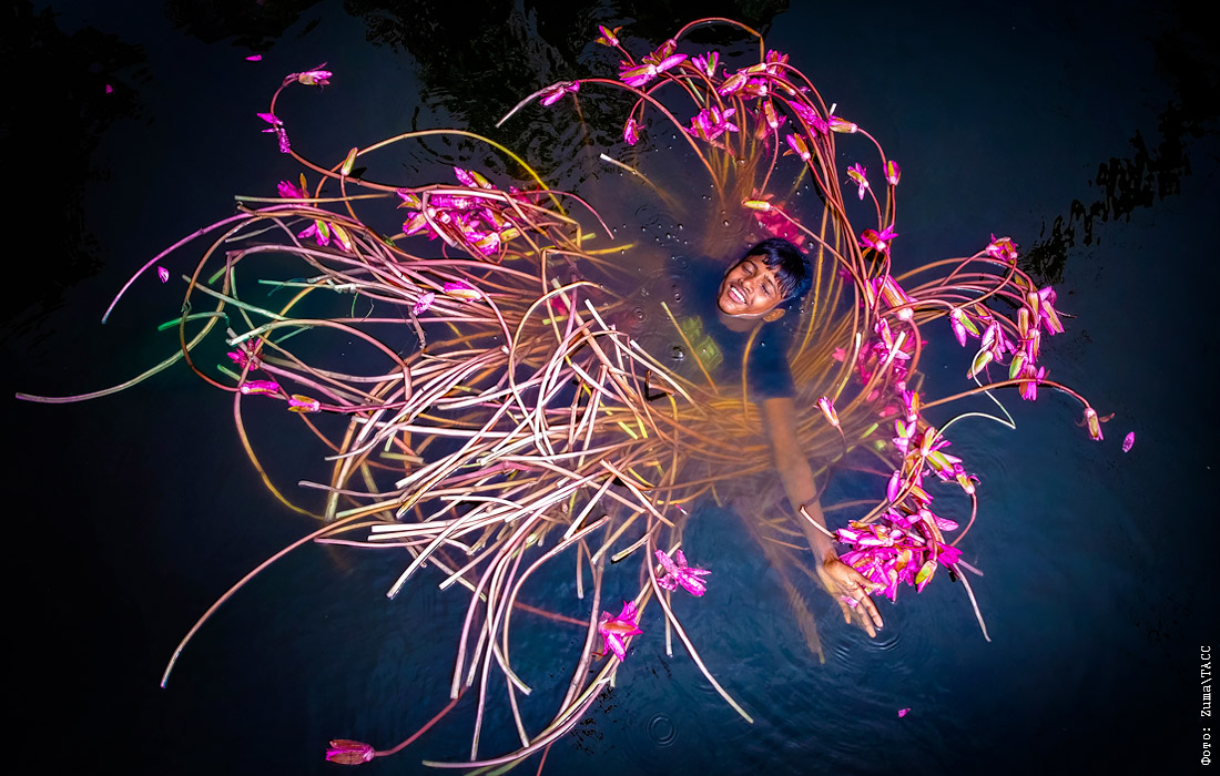 Мальчик плавает среди водяных лилий в Бангладеш