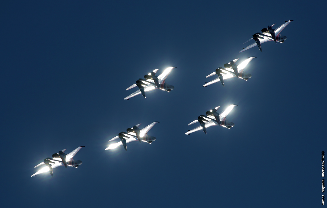 Многоцелевые истребители Су-35С пилотажной группы ВКС "Русские витязи"