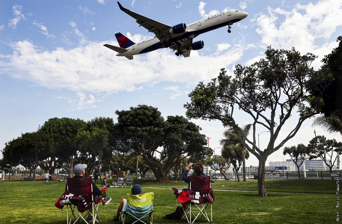 Отдыхающие в парке наблюдают, как самолет Delta Air Lines приземляется в аэропорту Лос-Анджелеса
