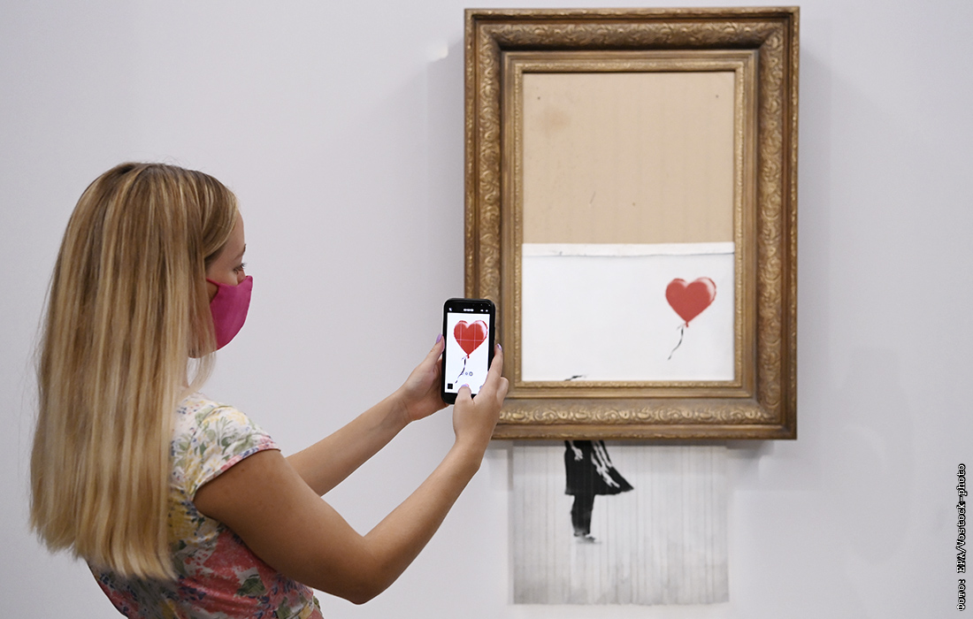Картина Бэнкси "Девочка с воздушным шаром" переименованная в "Любовь в мусорном баке" на предаукционной выставке Sotheby's в Лондоне