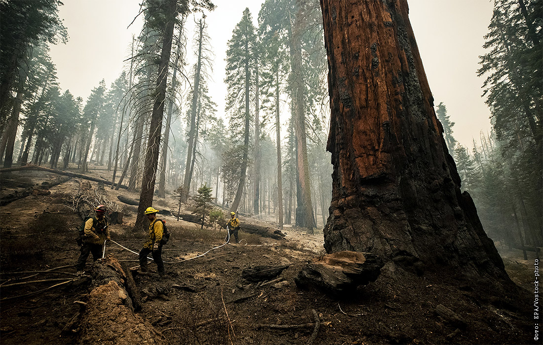 После пожаров в парке секвой в Калифорнии пожарные продолжают охлаждать разогретые огнем деревья