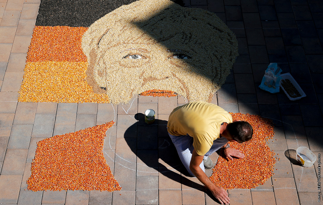 Художник из Косово Алкент Пожегу создает из зерен портрет уходящей с поста канцлера Германии Ангелы Меркель