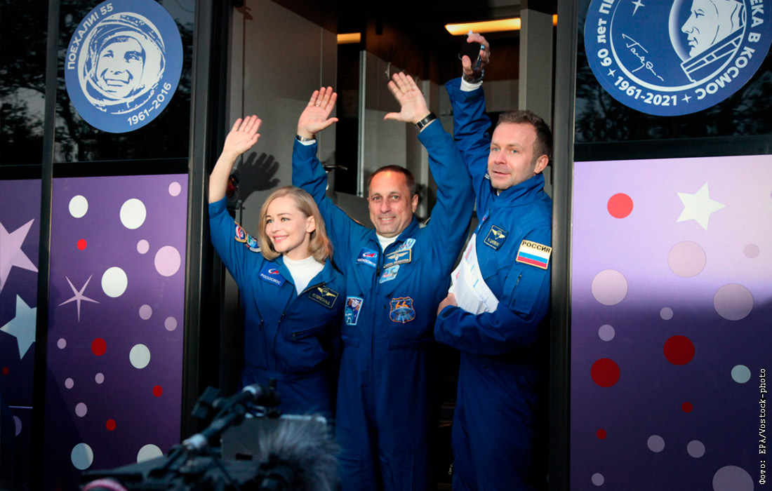 В основной экипаж утверждены актриса Юлия Пересильд, режиссер Клим Шипенко (справа) и командир МКС-66, космонавт Роскосмос Антон Шкаплеров (в центре)