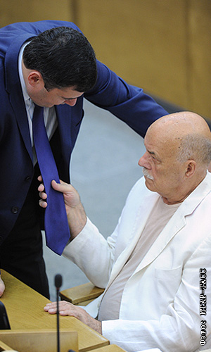 Заместитель председателя комитета ГД по безопасности и противодействию коррупции Александр Хинштейн и режиссер, депутат Госдумы Станислав Говорухин (слева направо) на пленарном заседании Государственной Думы РФ, посвященном вопросу о ратификации протокола о присоединении России к Всемирной торговой организации (ВТО).