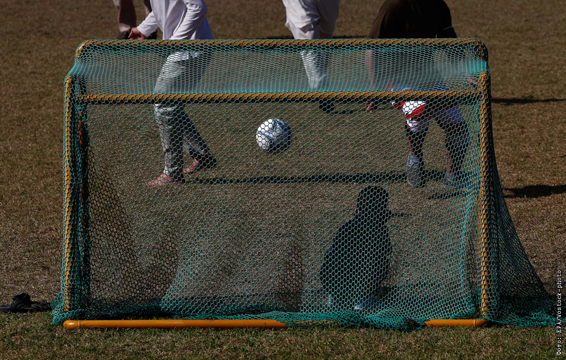 Афганские дети играют в футбол в лагере беженцев в Чинчхоне, Южная Корея