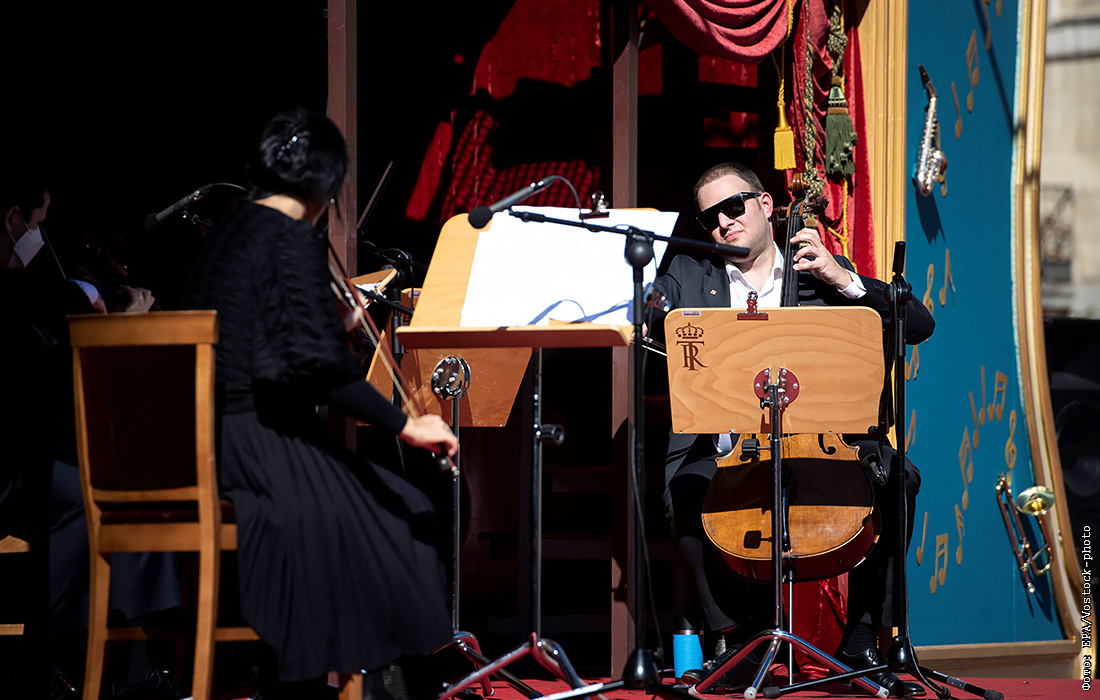 Музыканты выступают у оперного театра по случаю Всемирного дня оперы в Мадриде