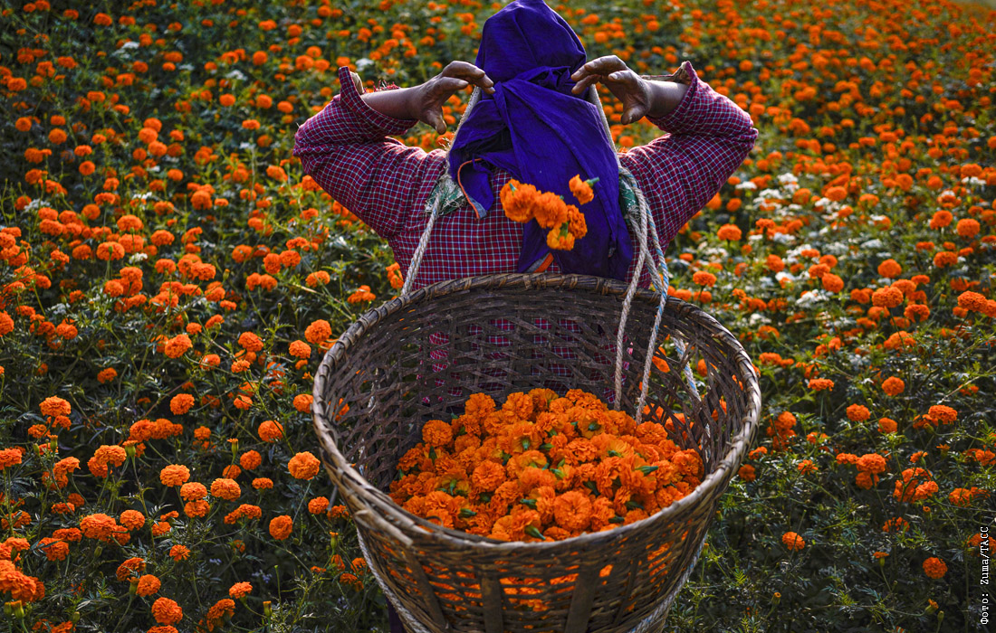 Непальцы во время сбора бархатцев к индуистскому фестивалю Тихар
