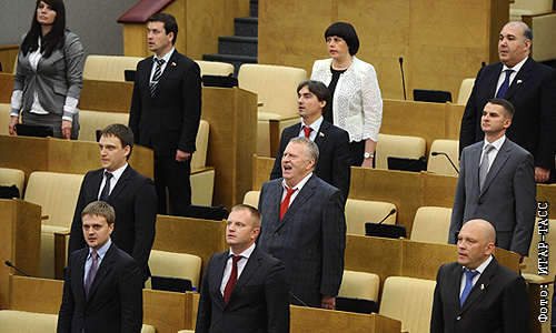 Члены фракции ЛДПР во время исполнения государственного гимна на завершающем заседании весенней сессии Государственной думы.