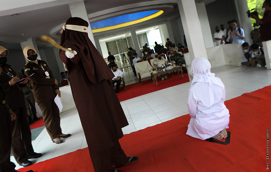 Палач из шариатской полиции во время наказания за нарушение исламского закона в индонезийском Банда-Ачех