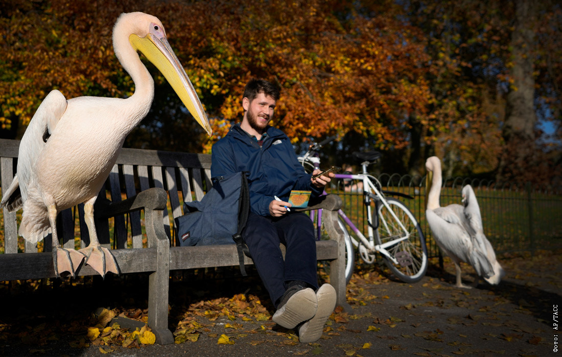 Пеликан делит скамейку с велосипедистом в Сент-Джеймсском парке в Лондоне