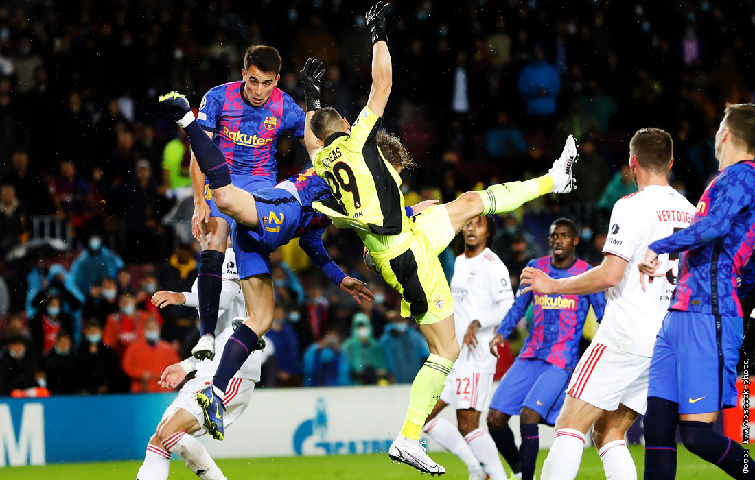 Защитник "Барселоны" Эрик Гарсия (слева) и полузащитник Френки де Йонг (2-й слева) против вратаря "Бенфики" Одиссеаса Влаходимоса (в центре) во время футбольного матча группы E Лиги чемпионов УЕФА в Каталонии