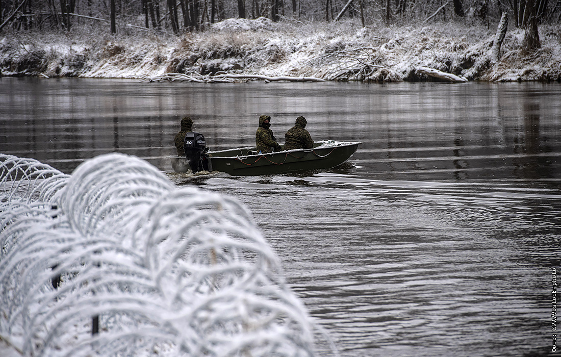 Польские солдаты патрулируют польско-белорусскую границу на реке Буг