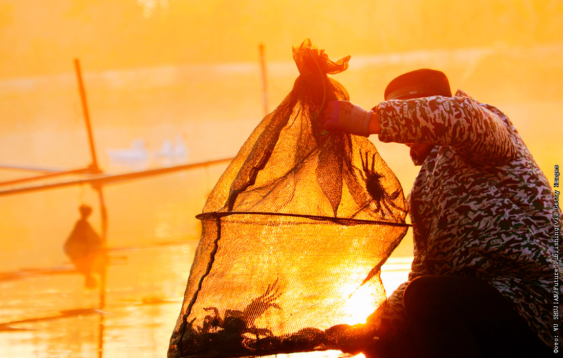 Фермер ловит крабов в пруду. Провинция Цзянсу, Китай.