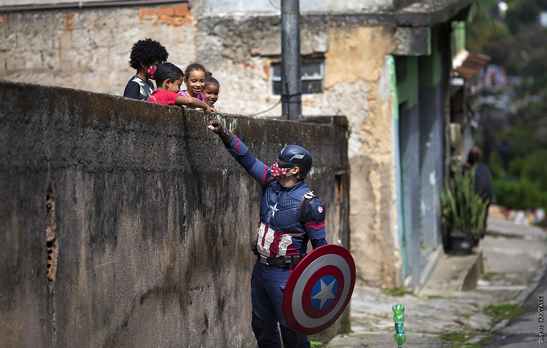 15 апреля. В Бразилии началась просветительская кампания, помогающая населению из трущоб узнать об оспасности и профилакте коронавирусной инфекции. На фото: офицер военной полиции в костюме Капитана Америка в Петрополисе.