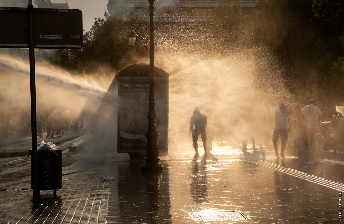 22 июля. Во многих европейских странах проходят акции против ужесточения антиковидных ограничений. На фото: греческая полиция использует водометы на митинге против обязательной вакцинации некоторых категорий граждан в Афинах.