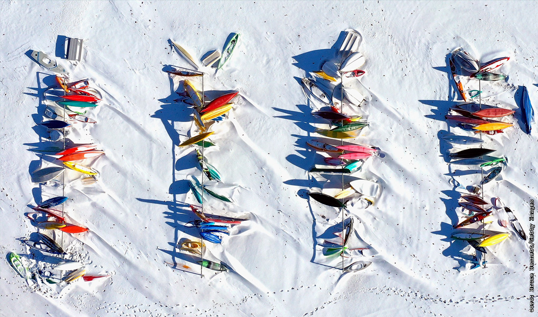 Каяки в снегу в Сентерпорте, штат Нью-Йорк