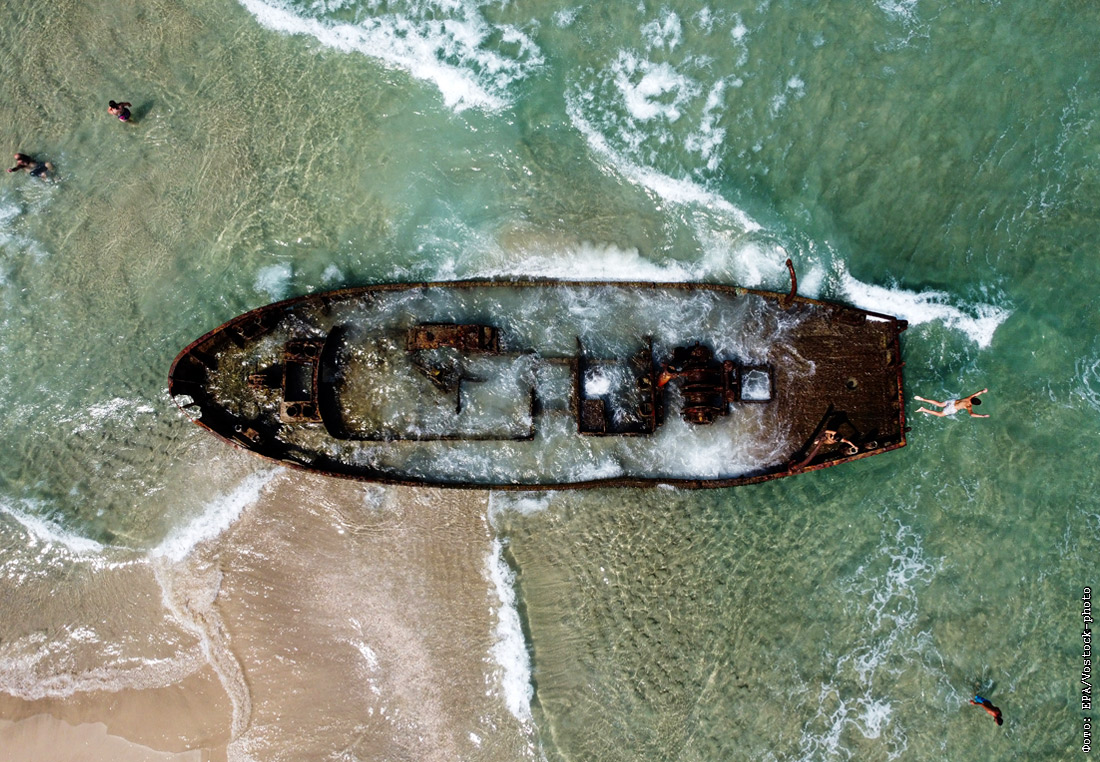 Обломки лодки на пляже Хабоним, Израиль