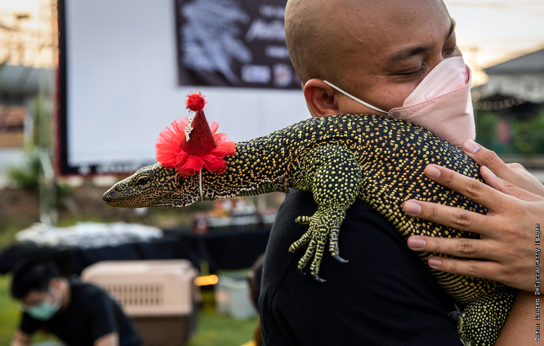 Мужчина обнимает варана в рождественской шляпе. Бангкок, Таиланд.