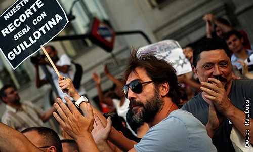 Актер Хавьер Бардем присоединился к участникам мадридской демонстрации. На плакате написано: "Наши урезания будут гильотиной".