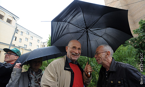 Писатель Григорий Чхартишвили (Борис Акунин) и поэт Лев Рубинштейн (слева направо на первом плане) во время акции у здания Хамовнического суда, где проходят слушания по делу участниц панк-группы Pussy Riot.