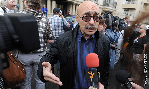 Художник-карикатурист Андрей Бильжо во время акции у здания Хамовнического суда, где проходят слушания по делу участниц панк-группы Pussy Riot.