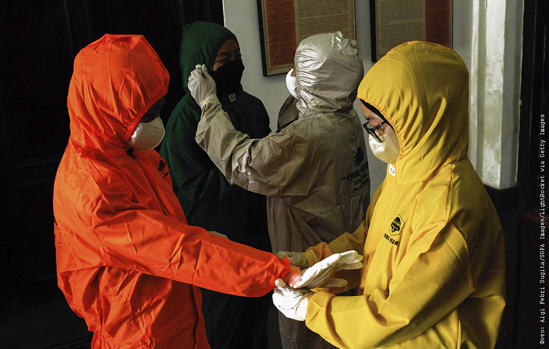 3 марта. Посетители в защитных костюмах перед входом на фотовыставку о пандемии в Индонезии.
