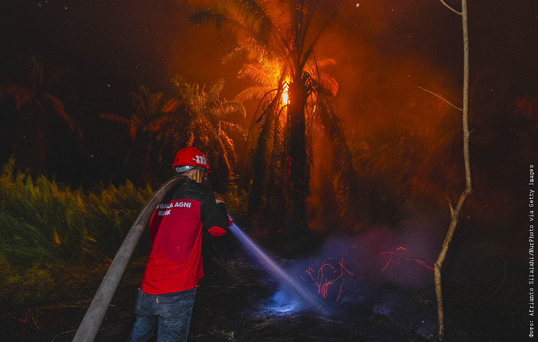 Пожарные тушат горящие торфяники в деревне Танджунг Куду, Индонезия