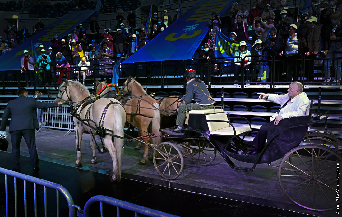 Лидер ЛДПР прибывает на предвыборный слет партии в карете, запряженной тройкой лошадей. Москва. Сентябрь 2021 года.