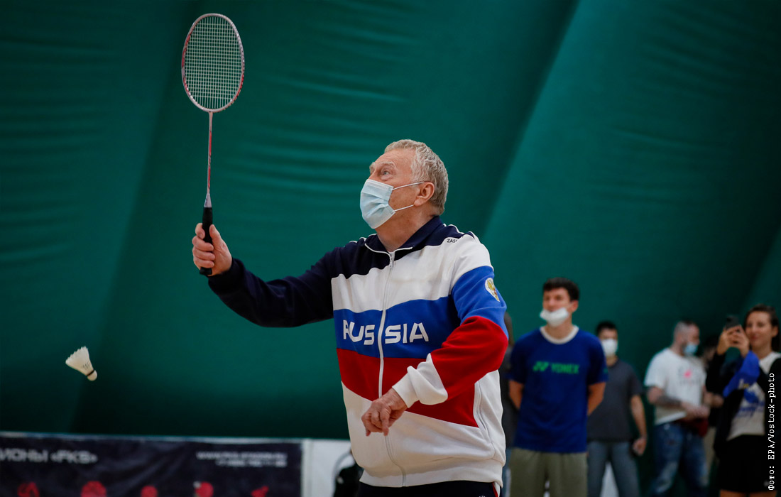 Жириновский играет в бадминтон в тренажерном зале в Москве. Август 2021 года.