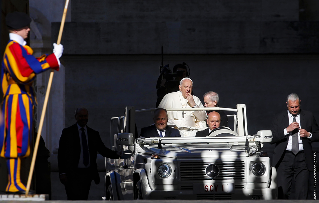 Папа Франциск во время своей еженедельной общей аудиенции на площади Святого Петра, Ватикан