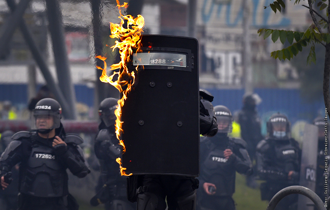 В Боготе офицер полиции держит щит, который загорелся из-за брошенного протестующим коктейля Молотова