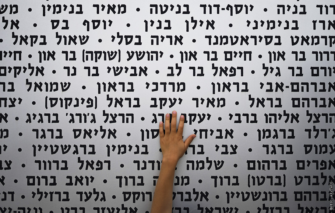 Ребенок прикасается к мемориальной стене в День памяти павших солдат в Латруне, Израиль
